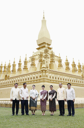 ラオスを公式訪問中の天皇、皇后両陛下の長女愛子さまは18日、首都ビエンチャンで最も格式の高い寺院にある金色の仏塔「タートルアン大塔」を見学された(代表撮影) 【時事通信社】