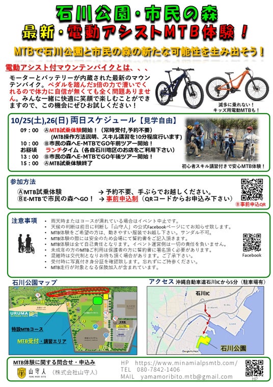 沖縄県中部のうるま市(人口12万人)の北部、石川地区の市街地にある石川公園、そして石川地区北部の山間部に位置する市民の森の新たな活用検討を目的として、マウンテンバイク(以下MTB)体験会を10月25日(土)、10月26日(日)に開催し約100名が参加しました。