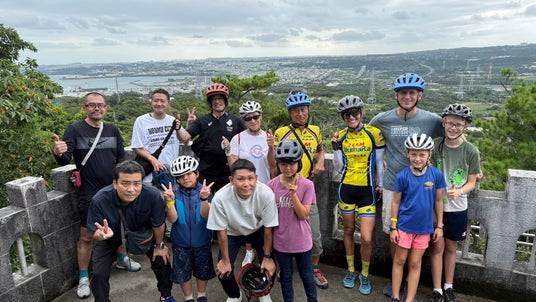 みんなで市民の森の展望台に上がり、沖縄本島の「みほそ」、西海岸と東海岸が非常に近いくびれ地形であることを改めて確認した。地元のサイクルプラザ池原チームもツアーをサポート。