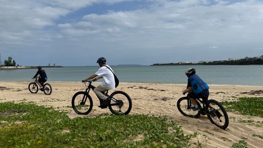 石川公園は海にも面しており、浜辺を太いタイヤでパワーのあるE-MTBで走破する参加者
