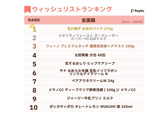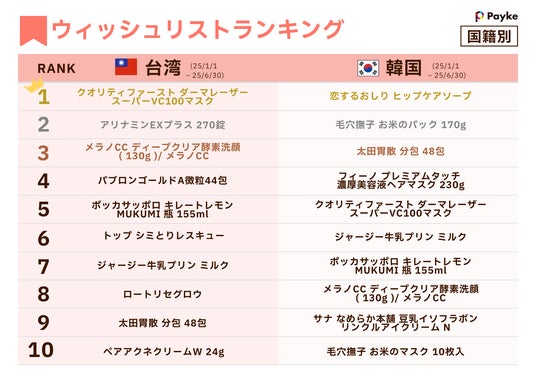 株式会社Payke(本社:沖縄県那覇市、代表取締役:古田 奎輔、以下Payke)は、提供する訪日外国人向けショッピングサポートアプリ「Payke(ペイク)」において、2025年1月1日~6月30日に取得されたデータをもとに、「ウィッシュリスト登録」商品ランキングを集計しました。今回は、全体(全国籍)と国籍別(台湾・韓国)のTOP10を発表します。