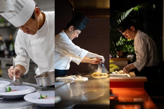 2万平方メートル の敷地に広がる静寂と美景のなか、レストラン棟ではフレンチ・江戸前鮨・鉄板焼きの3ジャンルのオーベルジュをお楽しみいただけます。