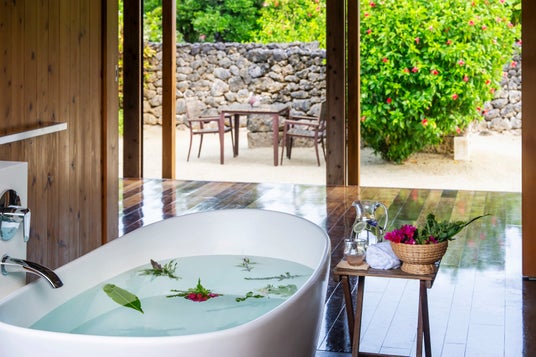 風が吹き抜ける客室で楽しむ、命草を浮かべた湯船