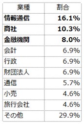 期間中にご挨拶・名刺交換のあった企業・団体の内訳は左図の通りで、情報通信・商社・金融機関をはじめ、行政、教育機関、観光関連、通信、小売、財団法人、自動車関連、エネルギー、運輸、宿泊、会計、広告代理業、制作、サービス、リースなど、非常に幅広い業種の皆さまがブースにお越しくださいました。