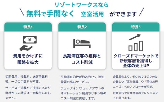 リゾートワークスでは、施設側の課題である稼働率の平準化や新規客層の獲得、オペレーション負荷軽減に貢献。空室を効率的に活用し、売上向上を支援しています。