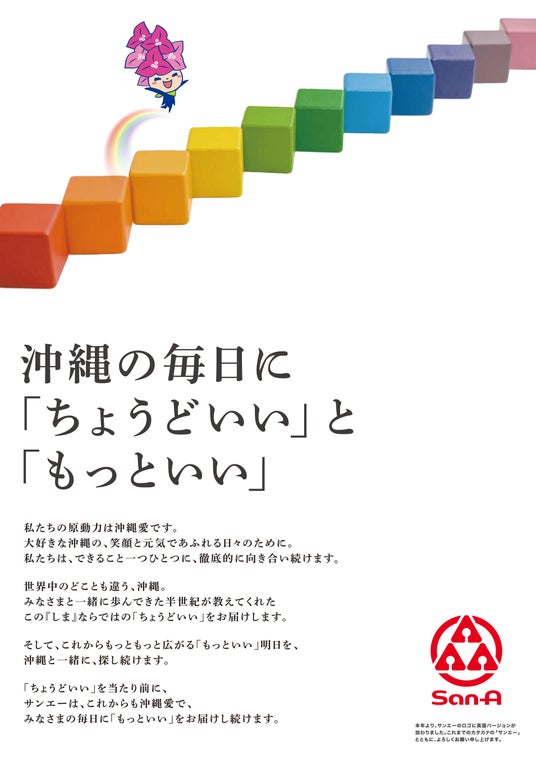 株式会社サンエー(本社:沖縄県宜野湾市、代表取締役社長:豊田沢)は、『沖縄の毎日に「ちょうど いい」と「もっといい」』というストアメッセージと、英字ロゴを新たに作成いたしましたのでお知らせ いたします。