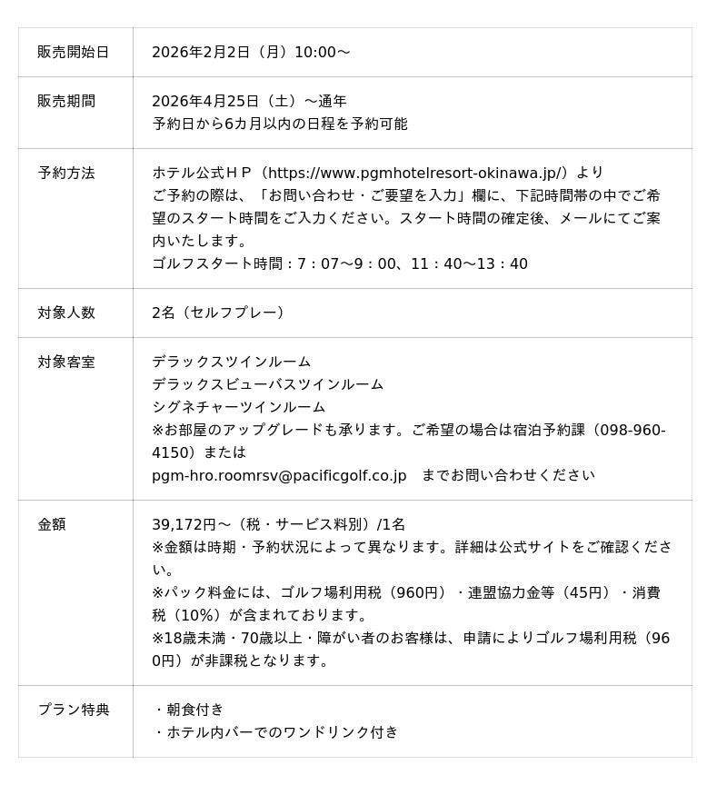 パシフィックゴルフマネージメント株式会社(本社:東京都台東区、代表取締役社長:田中耕太郎、以下PGM)が運営する、PGM初のラグジュアリリゾートホテル「PGMホテルリゾート沖縄」は、併設する「PGMゴルフリゾート沖縄」でのデイゴルフと、上質なホテルステイを組み合わせた2名様1室・ツーサムプレー確約の宿泊パッケージ「リゾートゴルフステイプラン」を2026年2月2日(月)10:00より、ホテル公式サイトにて販売開始いたします。