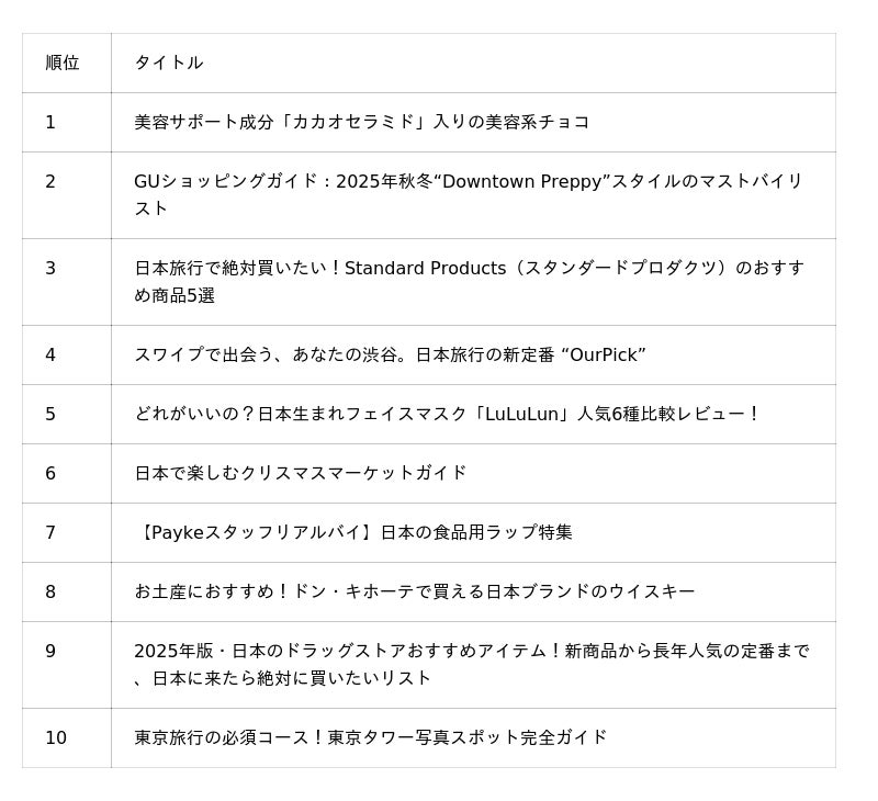 なかでも1位となった「美容系チョコ」の記事は、通常の菓子カテゴリーを超え、美容感度の高い層から多くの支持を集めました。また、Standard ProductsやLuLuLunといったブランド記事の上位ランクインからは、訪日客が「日本でしか買えない、質が高くて手頃な商品」を求めている傾向がうかがえます。