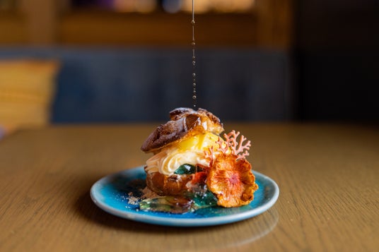 海の中の岩礁をイメージした一皿の上には、南国に咲く花に見立てたドライパインや、白い砂浜のように散りばめたクッキーの粒、そしてシーグラスに見立てた涼やかな琥珀糖をあしらいました。シュー生地のザクザク感に、口の中でふわっと溶けるアイス、琥珀糖のガリッとした小気味よい食感が重なり、一口ごとに新しい驚きが広がります。お好みでさんぴんシロップをかければ、華やかな香りがより一層際立ち、さらにお楽しみいただけます。