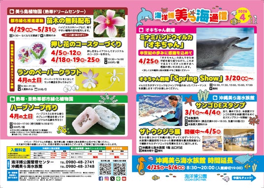 海洋博公園では、園内の最新情報やイベント情報をお届けする広報誌『美ら海通信』2026年4月号を発行いたしました。
