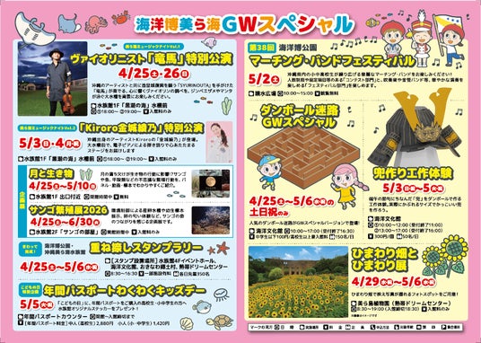 本号では、春の訪れを感じられるこの季節にぴったりのプログラムや自然にふれあえる体験、親子で参加できるイベントなどをを中心にご紹介しています。自然・文化・体験が融合した魅力的な海洋博公園にぜひお越しください。