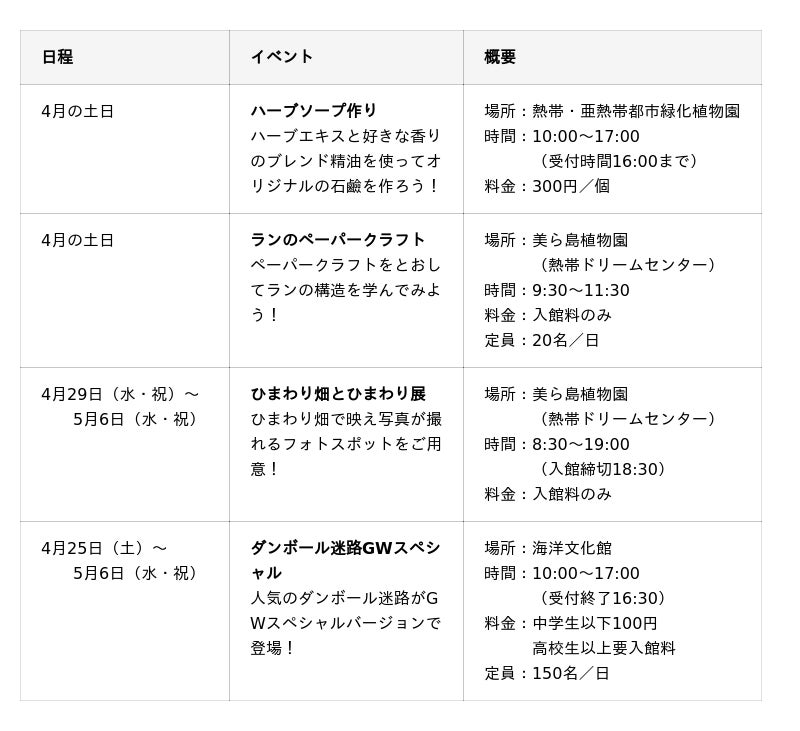 そのほか、押し花のコースターづくりや苗木の無料配布など、楽しいイベントが盛りだくさん!