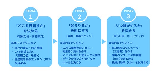 「DXに取り組みたいが、何から始めればいいかわからない」という経営者向けに、経営課題の整理から実行計画の策定まで、3つのステップで伴走します。