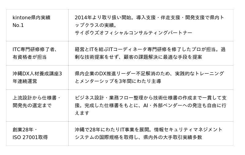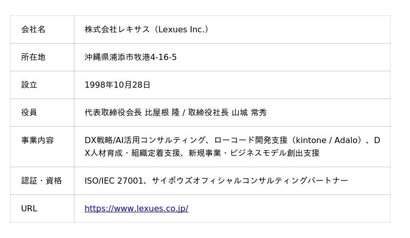 株式会社レキサスは、1998年に沖縄で創業したIT企業です。ソフトウェア開発・Web制作を中心に、28年にわたり沖縄の企業や自治体のデジタル化を支えてきました。2014年にはサイボウズ社のkintoneを取り扱い開始し、県内導入実績No.1を誇ります。2023年からは沖縄DX人材養成講座の企画・運営を3年連続で主導するなど、地域企業の「自走」を支援する取り組みを積み重ねてきました。