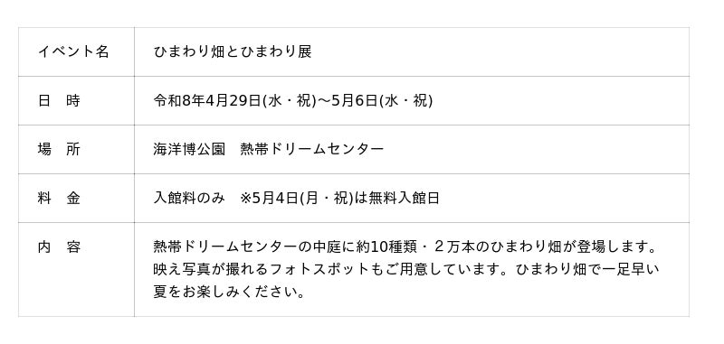 海洋博公園 熱帯ドリームセンターでは、令和8年4月29日(水・祝)より、「ひまわり畑とひまわり展」を開催します。約2万本のひまわりが彩る夏らしい景色をお楽しみください。